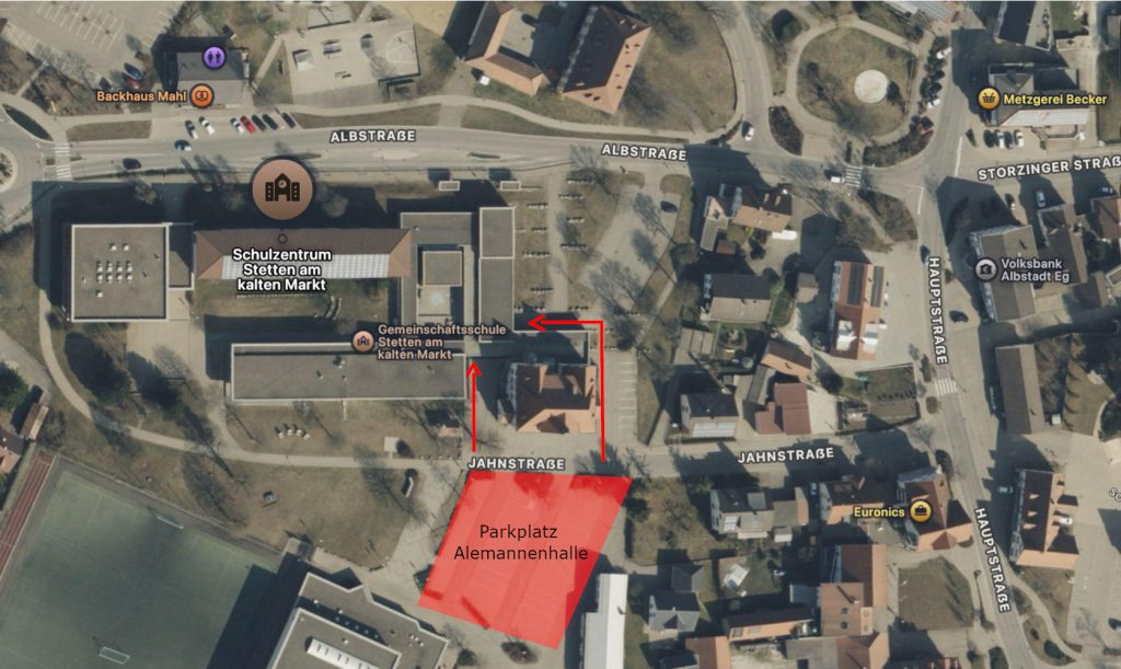 Parkhinweis für Besucher – Nutzung des Alemannenhallen-Parkplatzes: Alemannenhalle, Jahnstraße 11, 72510 Stetten a.k.M.