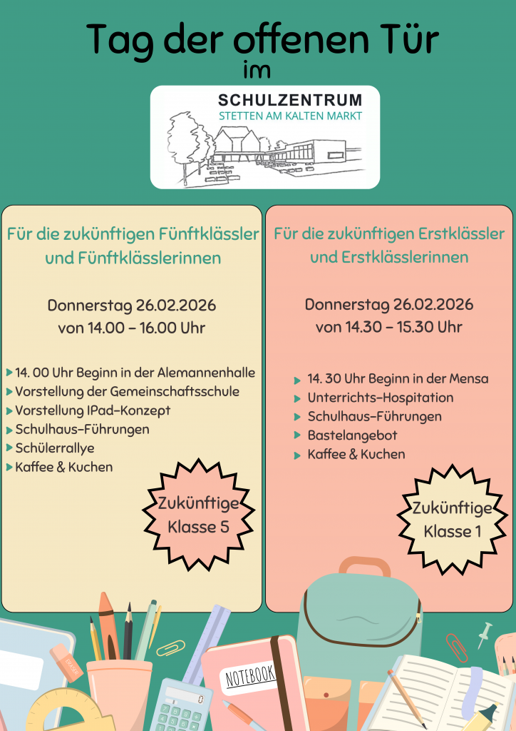 Am Donnerstag, den 26. Februar 2026 lädt das Schulzentrum Stetten am kalten Markt alle interessierten Eltern und Kinder herzlich zum Tag der offenen Tür ein. An diesem Nachmittag haben zukünftige Erstklässler sowie Fünftklässler die Gelegenheit, ihre neue Schule kennenzulernen und einen ersten Eindruck mit einem abwechslungsreichen Programm von der Schulgemeinschaft zu gewinnen.